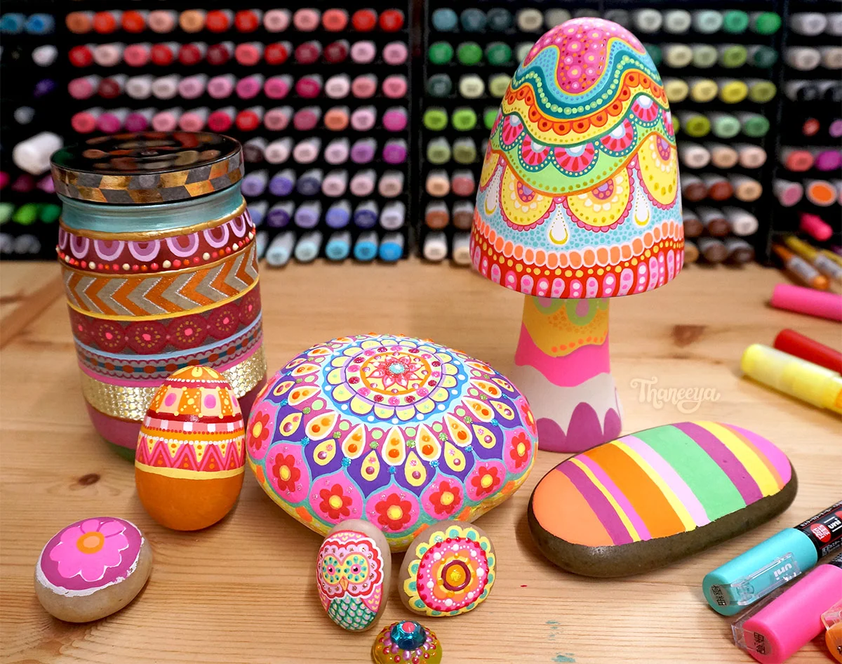 I've also been having a ball using paint markers and dimensional adhesives on a bunch of different surfaces, such as wood, ceramics, rocks and mason jars! Shown here are a few finished pieces and a few works-in-progress. Painting on 3D objects is so fun that I wish I could spend all day doing this, but these days I'm so busy with multiple deadlines that I can only spend a few minutes each day dabbling with my Paint Marker Projects (as I've dubbed them in my mind). Later this year when I have more time I plan to add a section to Art is Fun about using paint markers on all these surfaces, but that's another thing that'll have to wait until my workload lightens in a few months.